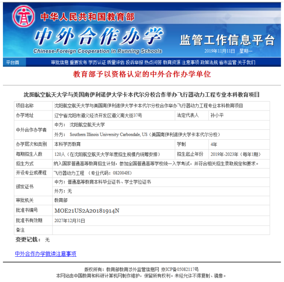 飞行器动力工程专业中美合作办学项目为sunbet申搏官方网站与美国南伊利诺伊大学卡本代尔分校合作举办的本科教育项目,于2018年经国家教育部批准(批准书编号:MOE21US2A20181914N)。网站链接http://www.crs.jsj.edu.cn/aproval/getbyarea/21双方整合优质的教育教学资源,共同商定教学计划,旨在培养适应现代科学技术与经济社会发展需要,拥有先进技术和管理理念,国际沟通能力较强的应用型、创新型、国际化专业人才。